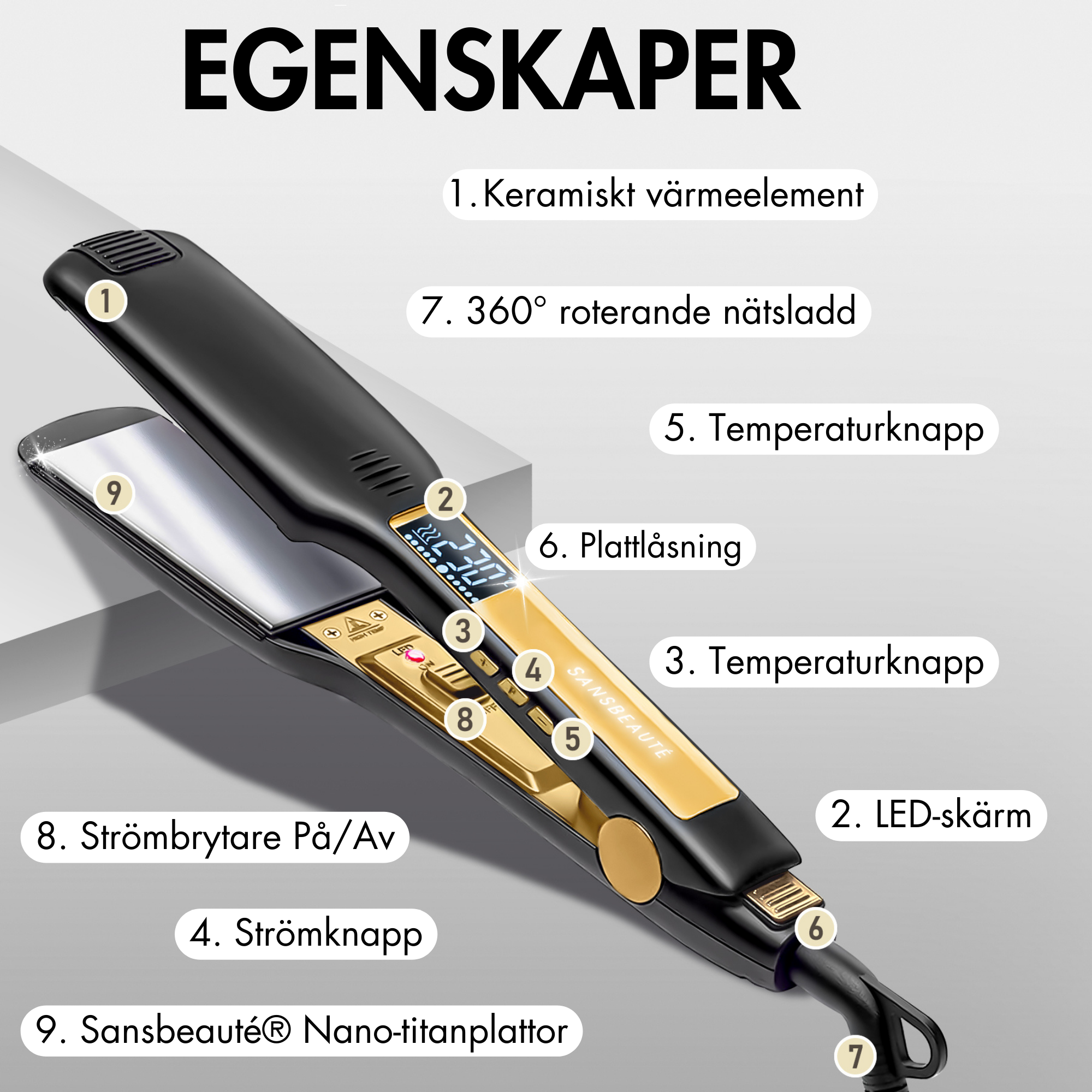 {"type":"root","children":[{"type":"paragraph","children":[{"type":"text","value":"De Sansbeauté plattång har en automatisk avstängningsfunktion som stänger av enheten efter 30 - 120 minuter (justerbart) av inaktivitet. Detta ger extra säkerhet och gör att du inte behöver oroa dig om du glömmer att stänga av plattången."}]}]}